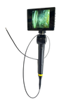 Vividia SV-2010S Flexible Side-View Borescope is a flexible non-articulation videoscope with 2 mm diameter probe head and 1 meter long probe insertion tube and a side-view camera. The camera resolution is 400x400 and the LCD monitor has 5" touchscreen with snapping and recording functions. The photos and videos are saved on a SD card. The probe is waterproof and protected with metal braided mesh layers for wear and tear in harsh industrial environments. Vividia SV-2010S borescope is a good choice for applications where articulation feature is not required, but small diameter camera is very important, and side-view close focus is required.