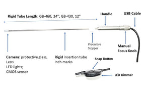 Vividia RC-3929 Manual Focus Rigid Inspection Camera Borescope with 3.9mm / 0.154" diameter 300mm / 12" long rigid tube, and 4.5" LCD monitor is ideal for detailed visual inspection in hard-to-reach places, especially for small objects. The resolution of RC-3929 is 1280x720, which gives a clear and sharp colored images.